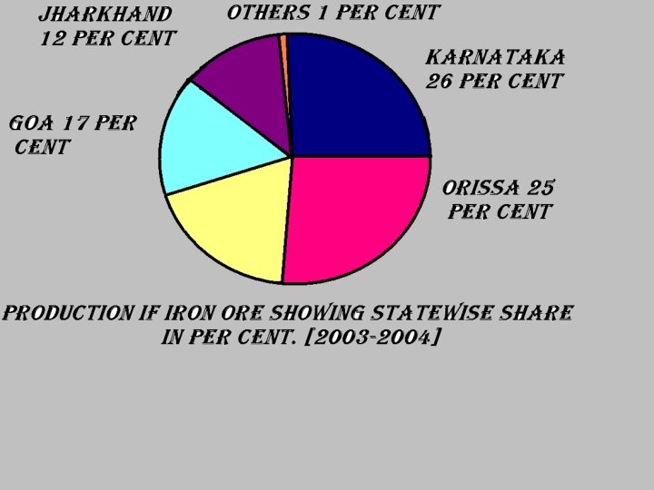 IRON ORE • Iron ore is he basic mineral & the backbone of industrial development. • India is endowed with fairly abundant resources of iron ore. • India is rich in good quantity of iron ore. • MAGNITITE is the finest iron ore with a very high content of iron up to 70 per cent. • It has excellent magnetic qualities , especially valuable in the electrical industry.