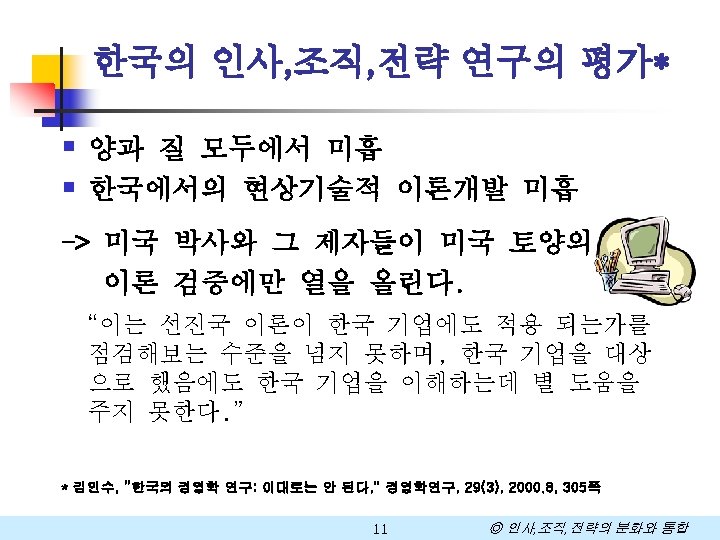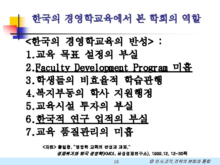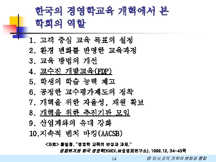 Social Sciences Citation Index - MANAGEMENT JOURNAL LIST (계속) § 36. ORGANIZATIONAL BEHAVIOR AND HUMAN § § § § § 37. 38. 39. 40. 41. 42. 43. 44. 45. DECISION PROCESSES ORGANIZATIONAL DYNAMICS (1972) ORGANIZATIONAL RESEARCH METHODS R & D MANAGEMENT RESEARCH POLICY RESEARCH-TECHNOLOGY MANAGEMENT REVIEW OF INDUSTRIAL ORGANIZATION STRATEGIC MANAGEMENT JOURNAL (1980) SYSTEMIC PRACTICE AND ACTION RESEARCH SYSTEMS RESEARCH AND BEHAVIORAL SCIENCE 8 ◎ 인사, 조직, 전략의 분화와 통합