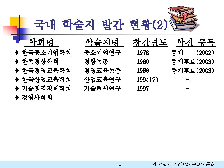 Social Sciences Citation Index - BUSINESS JOURNAL LIST : Total journals: 12/57 § § § 9. BUSINESS HISTORY 10. BUSINESS HISTORY REVIEW 14. ENTREPRENEURSHIP AND REGIONAL DEVELOPMENT 15. FORTUNE 25. JOURNAL OF BUSINESS 26. JOURNAL OF BUSINESS AND PSYCHOLOGY 27. JOURNAL OF BUSINESS AND TECHNICAL COMMUNICATION 28. JOURNAL OF BUSINESS ETHICS 29. JOURNAL OF BUSINESS RESEARCH (1973) 30. JOURNAL OF BUSINESS VENTURING 38. JOURNAL OF MANAGEMENT STUDIES 47. LONG RANGE PLANNING 9 ◎ 인사, 조직, 전략의 분화와 통합