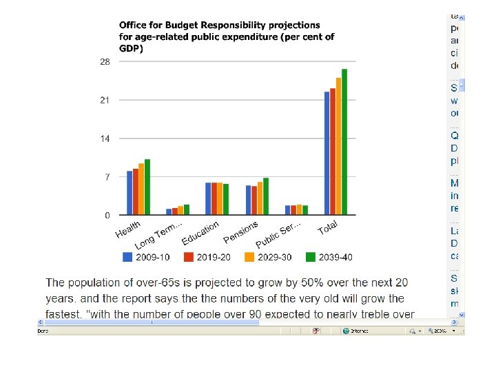 Growing pressures… • Fastest growing sector of the population is the over-80 s • Currently, 3 m are over age of 85 • Forecast is that will double to 6 m by 2030 • Of govt spending on benefits – 65% of DWP budget goes on older people (£ 100 bn in 201011) • NHS spending on retired households: £ 5, 200 • NHS spending on non-retired: £ 2, 800