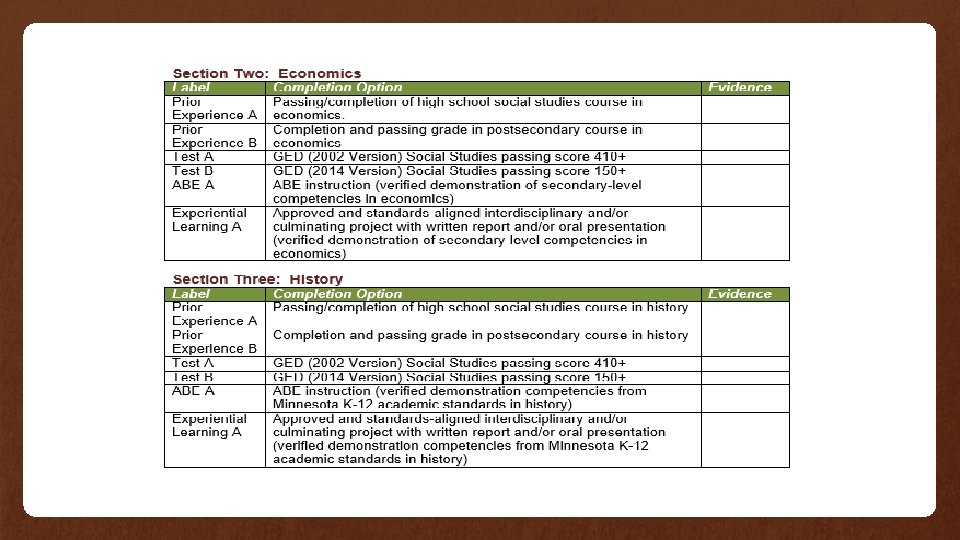 More Specifically… Potential Social Studies Competency Completion Options: Completion Option K-12 Social Studies Course Credit Passing and Completion Verification Completion and passing grade in postsecondary courses that align to identified competencies in social studies GED (2002 Version) Social Studies passing score 410+ GED (2014 Version) Social Studies passing score 150+ ABE instruction (verified demonstration of secondary-level competencies in the U. S. Government and Citizenship, Economics, History and Geography) Approved and standards-aligned interdisciplinary and/or culminating project with written report and/or oral presentation
