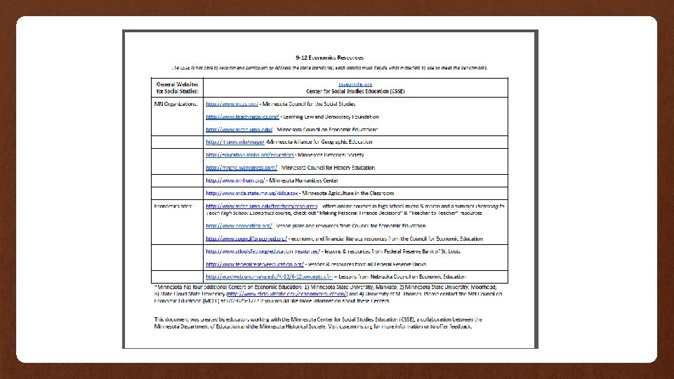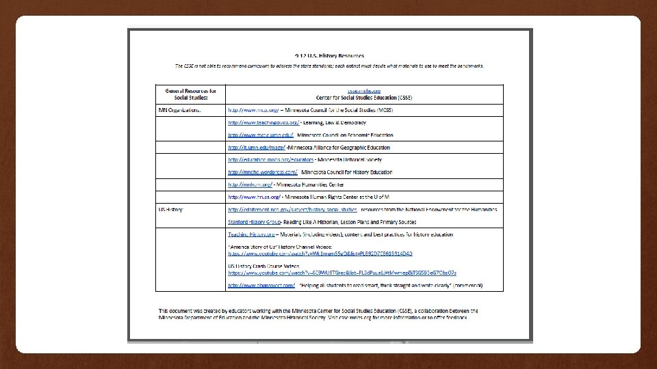 One Stop Shopping… • The Center for Social Studies Education (CSSE) • CSSE was established in 2009 as a partnership between the Minnesota Department of Education and the Minnesota Historical Society. • It maintains a regularly updated calendar of events related to social studies, as well as lesson plans and other resources for social studies instruction, curriculum, and assessment for social studies educators at all grade levels. • Visit the CSSE website at: http: //csse. mnhs. org/