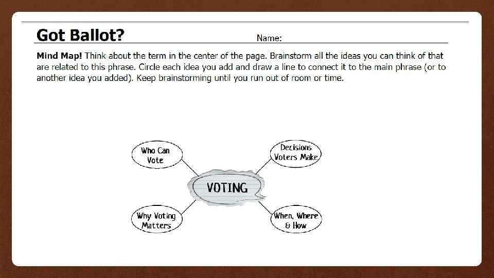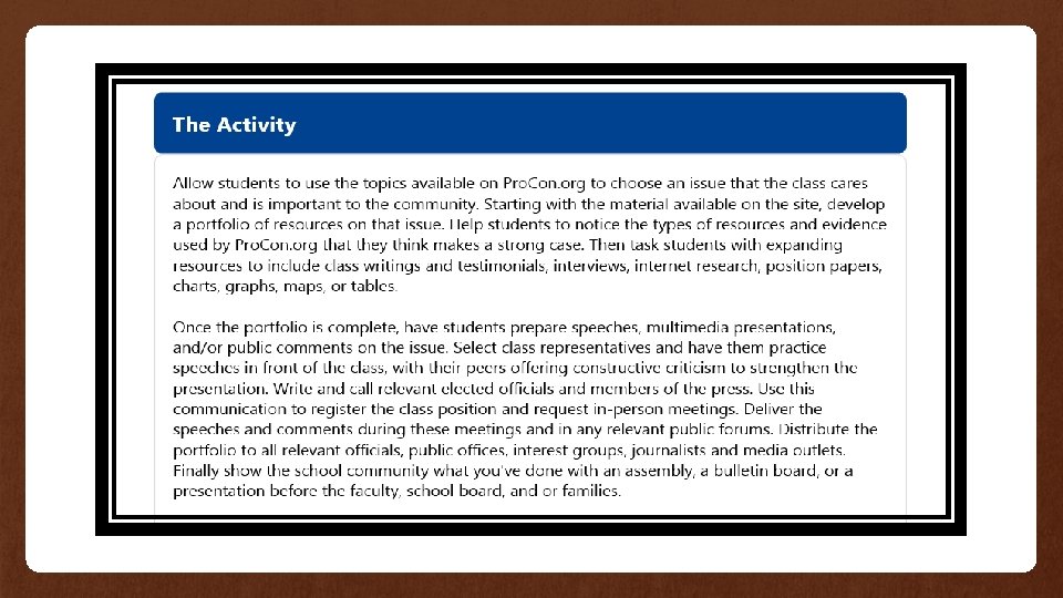 Another project idea from “Lessonsonlocalgovernment. org” Activities: 1. Brain storm issues of interest. 2. Select the one issue that is most interesting or important and put it into a question form. 3. Create a notebook, folder, or portfolio organizer to keep all of their work. 4. Research their issue. 5. Create an action plan. 6. Implement their plan. 7. Reflection. 8. Share their work as a portfolio. CIVIL ACTION PROJECT The student will select one issue that they believe to be the most important or interesting, and they will try to solve the problem or at least move it in the right direction.