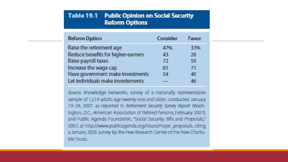 Reforming Welfare programs Both Social Security and Medicare currently under scrutiny because of potential problems some see in the future. There will soon be an insufficient number of people paying Social Security taxes to provide benefits for every retired person. By 2020… so 1 and half years workers will have to double their S. S. Tax to pay for retirees SOLUTIONS? 1. Raising the retirement age to 70 and raising Social Security Tax 2. Reduce benefits for high-earners 3. Raise payroll taxes 4. Increase the wage cap 5. Have the gov’t make investments 6. Let individuals make investments