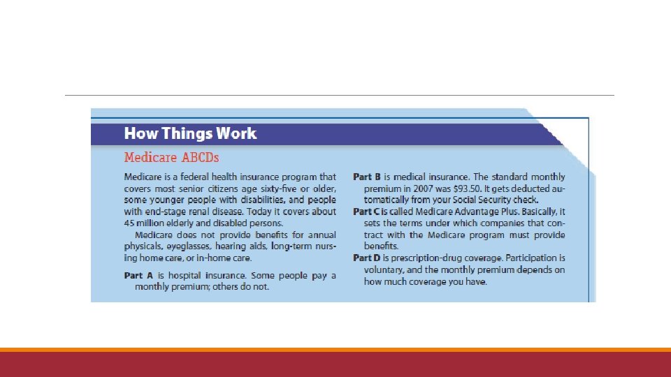 Problems with Medicare Way too expensive! Estimated to cost $12 billion a year in 1990, but actually cost $110 billion WHY? 1. A lot of people use medical services that they do not need (hospitals and doctors get paid a fee for every visit) 2. Doctors and hospitals overcharge the government for their services SOLUTIONS? 1. Get rid of Medicare and have doctors and hospitals word for the government. 2. Let the elderly take their Medicare money and buy health insurance from private suppliers ** Cutting benefits never goes over well, it would be political suicide. ** Interest groups such as AARP (American Association of Retired Persons) keep lobbying to protect benefits