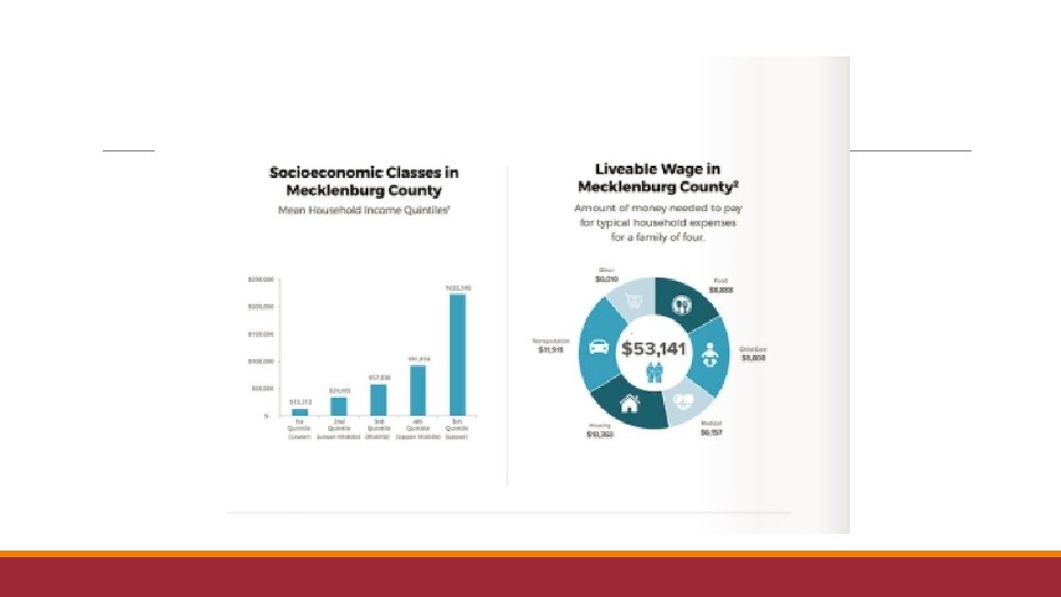 Income, Poverty, and Public Policy ◦ 125% of Poverty Line for family of four is $28, 800 ◦ Equals less than $20 per day, per family member ◦ From this amount all food, clothing, medical and entertainment costs must be paid ◦ Average rent in the U. S. is $804, when subtracting this amount, this family must survive on $13 per day, person. ◦ Average rent in Charlotte is $1347 ◦ “CHARLOTTE, NC (WBTV) -A team from Harvard found poor children raised in Mecklenburg County are among the least likely in the country to escape poverty as adults. Mecklenburg was second only to Baltimore County, Maryland. ”
