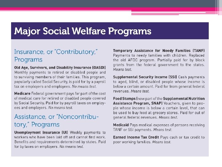 Social Welfare in the U. S. • Federalism’s Role ▫ U. S. Supreme Court’s reinterpretation in the 1930’s ▫ Individual states’ experiments with welfare programs • State Programs’ Double-Edged Effect ▫ Opponents of a federal social welfare system would say �“The states are already providing assistance. ” ▫ Supporters would say �“The states need national legislation to help them out. ”