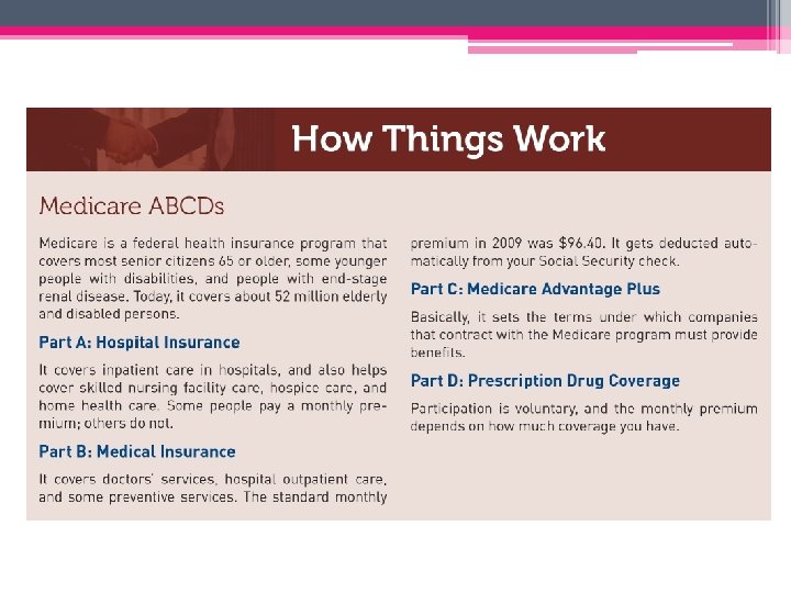 Medicare Act of 1965 • Medical benefits were omitted in 1935 in order to ensure passage of the Social Security Act • Covers medical care for the poor and • Pays doctors’ bills for the elderly
