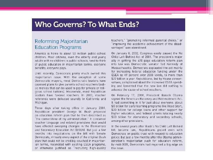 Majoritarian Welfare Program • Medicare ▫ Controversy �Not included in original Social Security bill �Actions of the House Ways and Means Committee �The 1964 Presidential Election �Becomes law with Medicaid attached