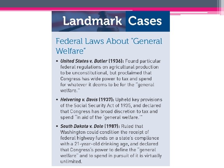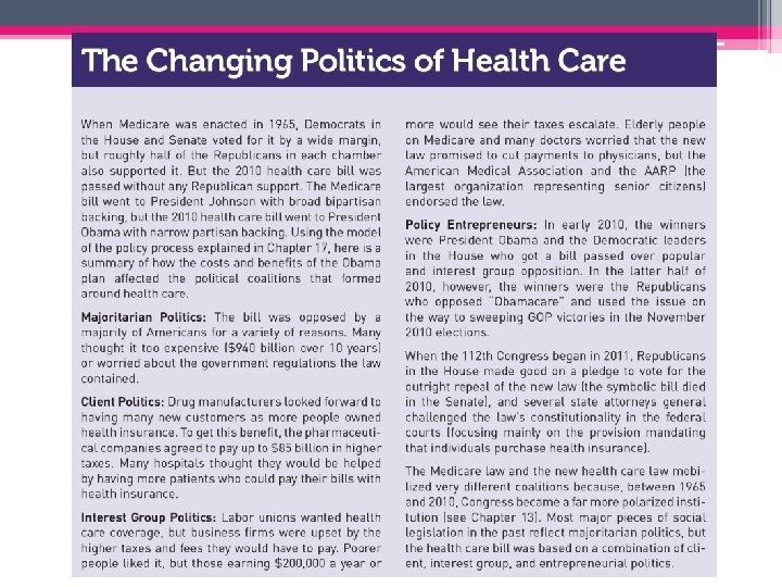 Majoritarian Politics Programs • Costs and benefits are widely distributed ▫ Examples �Social Security Act �Medicare Act • Question of legitimacy ▫ Conservatives argued that nothing in the Constitution authorized the federal government to spend money this way