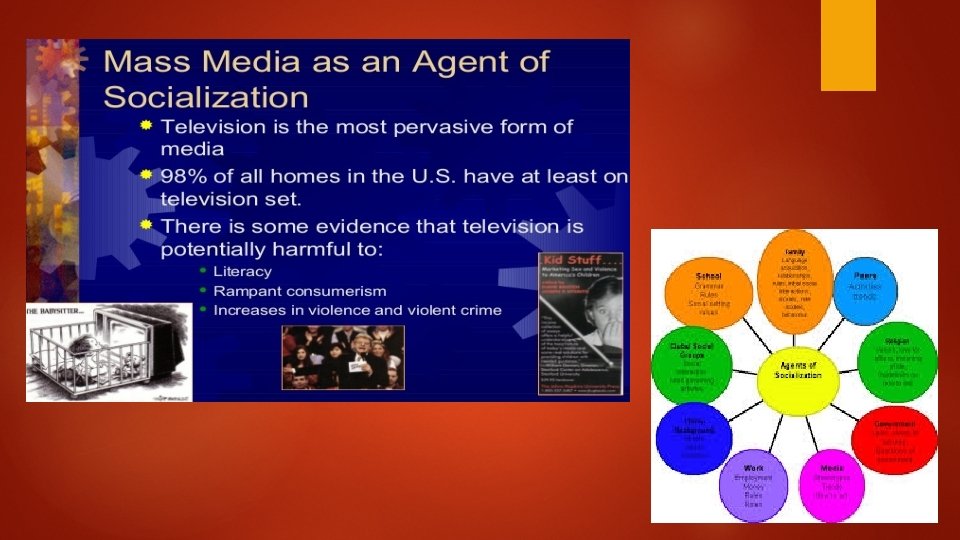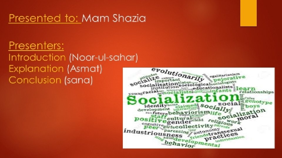 Socialization: Socialization is the process by which individuals learn about the culture , norms , values and expectations of the society they live in. it starts at birth and continues through childhood, which has been argued to be a crucial time for socialization. However, socialization continues throughout our lives through secondary agents of socialization: education , peer groups , the workplace , religion , the mass media and so on. Different types of sociologists see socialization differently: