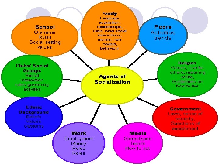AGENTS OF SOCIALIZATION l Agents of Socialization- the specific individuals, groups, and institutions that enable socialization to take place l In the United States, the primary agents of socialization include family, the peer group, the school, and the mass media.