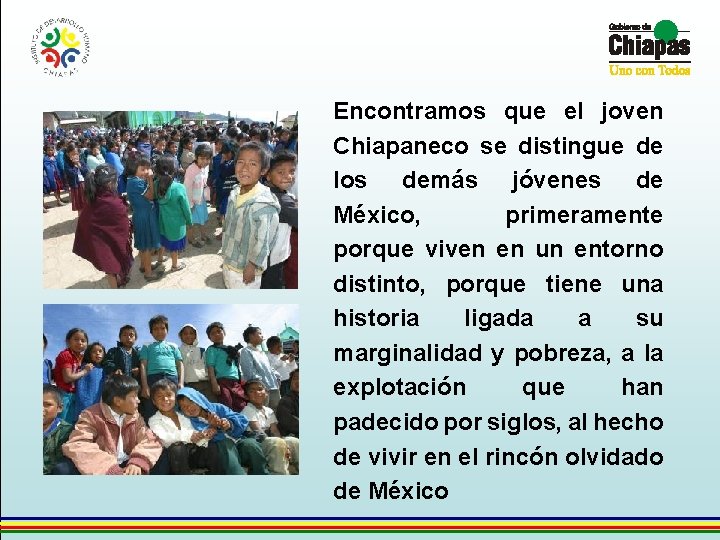 Encontramos que el joven Chiapaneco se distingue de los demás jóvenes de México, primeramente porque viven en un entorno distinto, porque tiene una historia ligada a su marginalidad y pobreza, a la explotación que han padecido por siglos, al hecho de vivir en el rincón olvidado de México