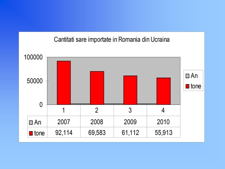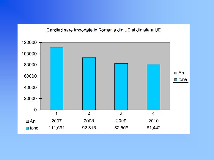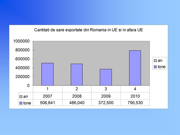PRODUCTIA MONDIALA DE SARE IN PERIOADA ANILOR 2003 -2009 (mii tone) La nivel mondial, in ultimii ani producţia mondială s-a stabilizat în jurul valorii de 250 milioane de tone. ( +/- 5%) Europa cu o productie de 64, 3 milioane de tone de sare ocupă locul 3 într-un top al continentelor după America de Nord şi Asia , producând 24% din producţia mondială de sare. La nivelul ţărilor, primele 5 în ordine dupa cantităţile de sare produse sunt: China (58 milioane tone), SUA (46 milioane tone), India (24 milioane tone), Germania (17 milioane tone) şi Canada (15 milioane tone). În Europa, Germania este cel mai mare producător de sare, producând 6, 3 % din producţia mondială sau 26, 6 % din producţia europeană. România se situează pe locul 9 în ordinea cantităţilor de sare produse, in Europa, producand 3, 9 % din producţia europeană de sare sau 0, 93 % din producţia mondiala de sare. 2003 2004 2005 2006 2007 2008 2009 Total MONDIAL 219, 636 234, 714 250, 067 259, 851 249, 704 256, 772 266, 700 Total EUROPA 60, 699 65, 072 67, 263 71, 437 61, 151 60, 013 64, 356 Total AFRICA 5, 193 4, 884 4, 926 4, 903 4, 683 4, 901 7, 250 Total AMERICA DE NORD 67, 271 71, 351 70, 599 68, 358 65, 992 70, 300 69, 913 Total AMERICA DE SUD 15, 523 14, 167 16, 516 15, 277 15, 934 17, 589 19, 264 Total ASIA 60, 282 67, 924 78, 374 88, 429 91, 040 92, 741 95, 534 Australia 10, 560 11, 221 12, 299 11, 364 10, 801 11, 160 10, 316 Noua Zeelanda 108 94 90 83 102 67 67