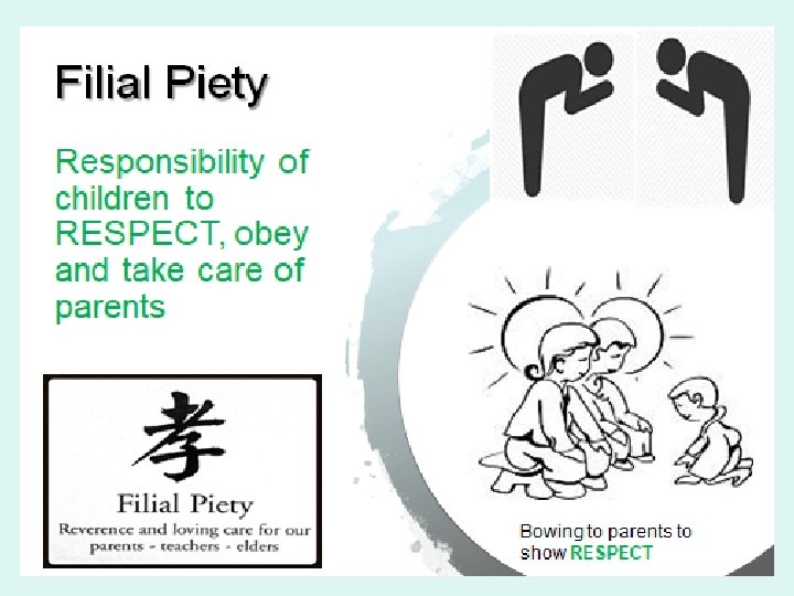 What were Chinese Families Like? • Family was at the center of early Chinese society • Practiced filial piety-people’s responsibility to respect and obey their parents • Required people to take care of their parents