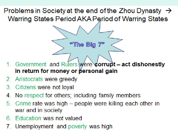 Objectives 6. 33 Describe how the size of ancient China made governing difficult and how the concepts of the mandate of heaven and Legalism emerged as solutions to this problem. C, G, H, P 6. 34 Identify the political and cultural problems prevalent in the time of Confucius and how the philosophy of Confucianism and The Analects emphasized the concepts of kinship, order, and hierarchy to address these problems.