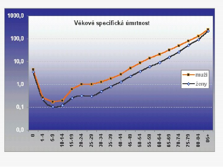 Zdravotnická statistika UKAZATELE vycházející z evidence ZEMŘELÝCH Úmrtí – trvalé vymizení všech znaků života kdykoliv po narození živého plodu o hlavní zdroj info: List o prohlídce mrtvého (LPM) o o o v matematickém vyjádření jde o relativní ukazatele, kde čitatelem počet úmrtí, jmenovatelem počet osob daného populačního celku Celková (hrubá) úmrtnost počet zemřelých/střední stav obyv. X 1000 ( v určitém kalendářním roce) Specifická úmrtnost (úmrtnost v dané věkové kategorii) počet zemřelých ve věku x / stř. stav obyv. ve věku x X 1000