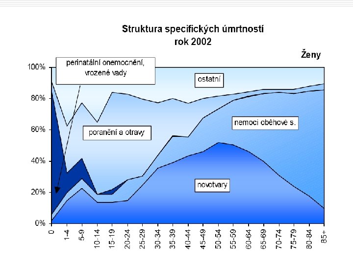 Samostatná práce – úkol na výpočet ukazatelů Skupina A: vypočítá hrubou úmrtnost (celkovou), zvl. pro muže a pro ženy, podíl M a Ž na zemřelých, vyjádří strukturu obyvatelstva dle věku a pohlaví(v %), přirozený přírůstek o Skupina B: kojenecká úmrtnost, novorozenecká úmrtnost, ponovorozenecká úmrtnost, podíl novorozenecké a ponovorozenecké na KÚ(v%), úmrtnost na karcinom –celkově pro obě pohl. a zvl. M a Ž, podíl karcinomu na všech úmrtích( zvl. M a Ž) o o Obě skupiny u každého ukazatele určí zda je frekvenční či strukturální