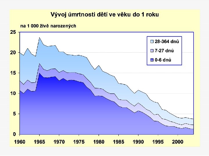 Zdravotnická statistika Kojenecká úmrtnost počet zemřelých do 1 roku/ počet živě nar. X 1000 ( ‰) výstižný ukazatel zdravotního stavu i socioekonomických poměrů v dané společnosti Další ukazatel úmrtnosti kolem porodu poporodní (do 3 dnů) časná (do 7 dnů) novorozenecká (0 -27 dní) endogenní příčiny – poruchy, se kterými se dítě narodilo nebo ke kterým dojde během porodu (VVV), lze ji jen málo ovlivnit ponovorozenecká (28 -365 dní) exogenní příčiny – poruchy, k nimž dochází po narození (výživa, hygiena, úroveň zdravotní péče, prostředí…životní a kulturní úroveň rodičů, jejich vzdělání) perinatální (mrtvě narození)