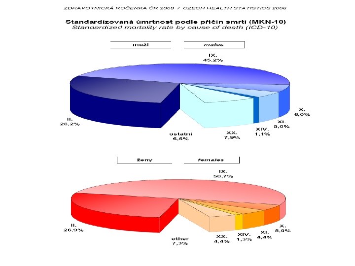 Statistika příčin smrti a zemřelých Přednosti: Zápory: o úmrtí je jev neopakovatelný, snadno a rychle rozpoznatelný o úmrtí lze přesně časově určit o dlouhodobé časové řady o mezinárodní srovnání o upřesnění příčiny smrti pitvou o zachycuje pouze nemoci, které vedou ke smrti o zkreslení (otázka spolehlivosti údajů a chyb) o neznámá míra přesnosti (může se lišit podle místa či času)
