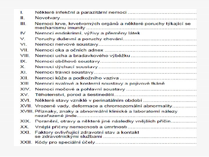 B: Statistiky nemocnosti o Mezinárodní statistická klasifikace nemocí a přidružených zdravotních problémů (MKN), 10. revize, 2. aktualizované vydání o Klasifikace nemocí (úrazů, vad, poruch, komplikací, léčebné péče atd. ) do kapitol, podkapitol a skupin. o Umožňuje zaznamenávat a statisticky zpracovávat údaje o zdravotním stavu a zejména jejich srovnávání. o 22 kapitol (římská čísla), 4 – místné alfanumerické kódy pro jednotlivé diagnózy