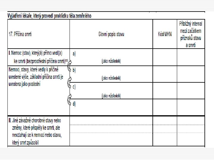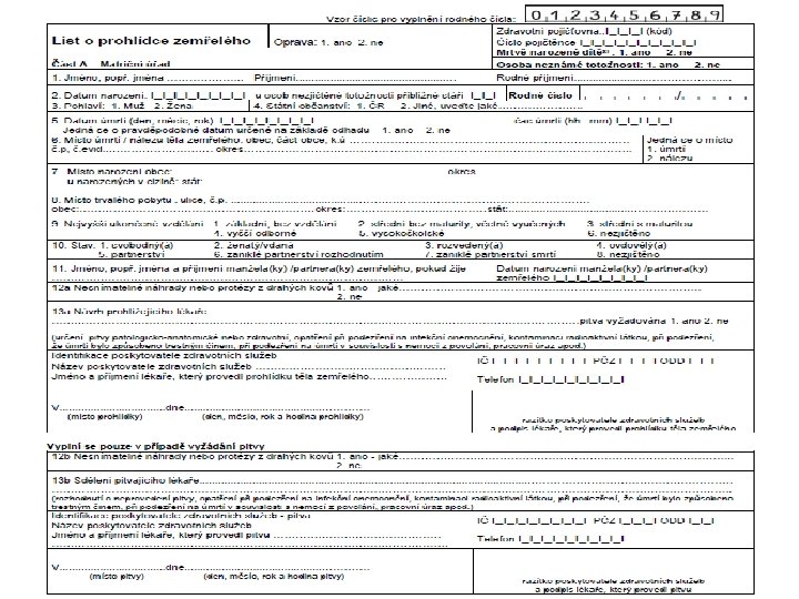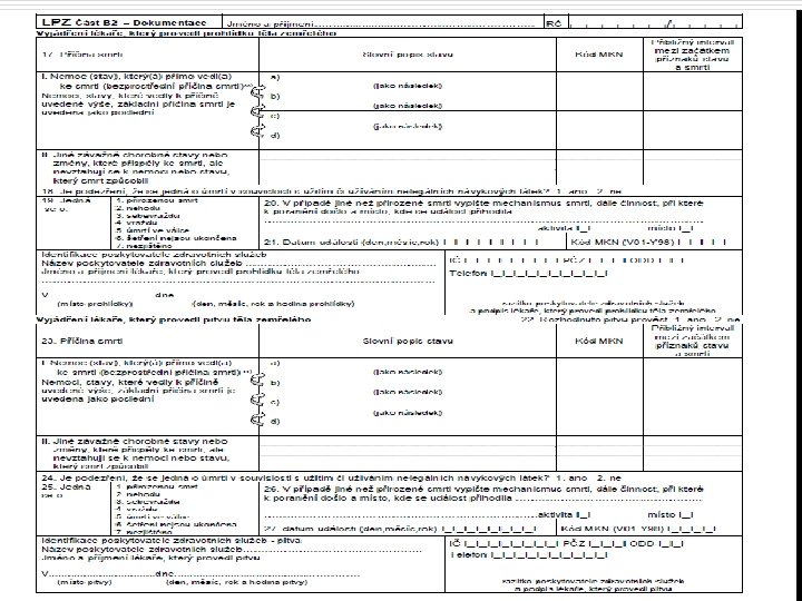 List o prohlídce zemřelého (LPZ) ČR – údaje o zemřelém jsou zaznamenávány na Listu o prohlídce zemřelého o Vyplňován ohledávajícím lékařem na základě dostupných informací o Podklad pro matriku o Od 1. 1. 2013 nový formulář odpovídající doporučením WHO o Administrativní část : jméno, rodné číslo, rodinný stav, vzdělání, bydliště, datum a místo úmrtí o Lékařská část – bezprostřední, zprostředkující a základní příčina smrti, údaje z pitvy, v případě vnější příčiny – okolnosti smrti