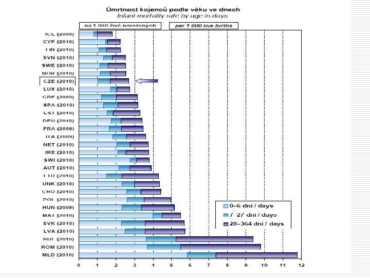 Ukazatele zdravotního stavu založené na evidenci zemřelých o Kojenecká úmrtnost počet zemřelých do 1 roku / počet živě nar. X 1000 (‰) výstižný ukazatel zdravotního stavu i socioekonomických poměrů v dané společnosti KÚ (r. 2011) = 2, 7 ‰ Další ukazatel úmrtnosti kolem porodu poporodní (do 3 dnů) časná (do 7 dnů) novorozenecká (0 -27 dní) endogenní příčiny – poruchy, se kterými se dítě narodilo nebo ke kterým dojde během porodu (VVV), lze ji jen málo ovlivnit ponovorozenecká (28 -365 dní) exogenní příčiny – poruchy, k nimž dochází po narození (výživa, hygiena, úroveň zdravotní péče, prostředí…životní a kulturní úroveň rodičů, jejich vzdělání) perinatální (součet mrtvě narozených a zemřelých do 7 dnů života na 1000 všech narozených))