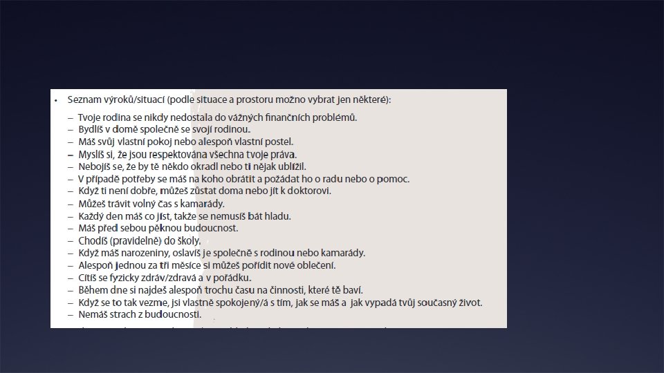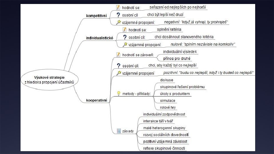 • Společný cíl, Příklady: a) Abyste uspěli v tomto úkolu, každý ve vaší skupině musí přispět nejméně pěti nápady, jak… (zachovat stabilitu této konstrukce apod. ) b) Vaším týmovým cílem je, aby každý ve skupině rozuměl učivu o… (třech základních typech pomoci apod. ) c) Každá skupina vytvoří jediný diagram s tím, že všichni se na něm budou nějakým způsobem podílet. • Odměna, Příklady: a) Pokud všichni členové skupiny dokončí úkol, můžete si vybrat volitelnou aktivitu (filmové nebo hudební ukázky vztahující se k tématu, …) b) Každý ze skupiny získá v testu body navíc, pokud všichni ve skupině budou umět vysvětlit minimálně devět pojmů z deseti zadaných v testu. c) Jestliže všichni členové skupiny vysvětlí, jak řešit tento typ rovnic a uvedou řešení, potom každý ze skupiny může v domácím úkolu vynechat pět libovolných příkladů.