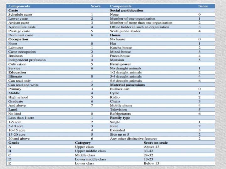 • The 9 factors included in Udai Pareek scale: • Caste • Occupation • Education • Land • Social participation • House • Farm power • Material possessions • Family type