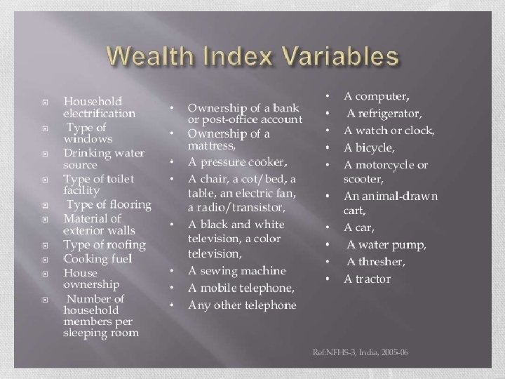 • The NFHS-3 had used the wealth index for determining the living standards of the population. • The NFHS-4 was conducted among more than 6 lakh households in 2015 -16 • The wealth index as part of NFHS-4 was prepared on basis of information of scores on ownership of consumer goods such as television and bicycles and others, and household characteristics such as availability of clean drinking water • This information was used to classify all households into wealth quintiles. Those in lowest quintile were poorest 20%, while those in top were richest 20% of lot. The report then used these quintile scores to classify population for states, caste and religious groups and rural-urban areas into each quintile. (15)