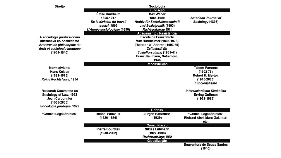- Sociologia Fundação Émile Durkheim Max Weber 1858 -1917 1864 -1920 Archiv für Sozialwissenschaft und Sozialpolitik(1903) L’Année sociologique (1896) Apagamento / Resist ência Escola de Francoforte Max Horkheimer (1895 - -1973) Theodor W. Adorno (1903 - -69) Zeitschrift für - -41) Sozialforschung (1931 American Journal of Sociology (1895) Reconstrução Talcott Parsons (1902 -79) Robert K. Merton (1910 -2003) Funcionalismo - Interaccionismo Simbólico Erving Goffman (1922 -1982) Michel Foucault (1925 -1984) Críticas Jürgen Habermas (1929) Pierre Bourdieu (1930 -2002) Consolidação Niklas Luhmann (1927 -1998) Globalização Boaventura de Sousa Santos (1940)