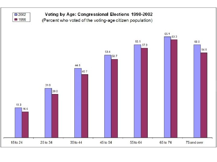 Age • Older Americans are more likely to vote than are younger Americans • Higher degree of political efficacy (my vote really matters and counts…makes a difference) • More knowledge of political issues and history • Generally more free time as compared to the youth • Higher sense of patriotic duty to your country