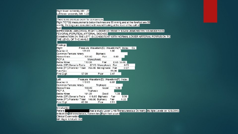 Case Study ABI’s Impression Single - level lower extremity arterial single-level pressures and PVR waveforms were performed. Right lower extremity ABI: 1. 94 Left lower extremity ABI: 1. 94 Right TCPO 2 measurements below the knee are 17 mm. Hg and at the forefoot are 9 mm. Hg. Left TCPO 2 measurements below the knee are 17 mm. Hg and at the forefoot are 3 mm. Hg. Findings are equivocal and readings are not in a range in which wound healing can be predicted at the level of the calf or the foot. Question accuracy due to patient movement. When compared to previous exam done on March 28 th, 2016 this exam is significantly changed. IMPRESSION: ABNORMAL RIGHT LOWER EXTREMITY EXAM DEMONSTRATES SEVERE TIBIAL ARTERIAL DISEASE. EXAMINATION ON THE LEFT IS CONSISTENT WITH NORMAL LOWER ARTERIAL PERFUSION TO THE LEVEL OF THE ANKLE. THERE IS ARTIFICIAL ELEVATION OF ANKLE-BRACHIAL INDICES, SUBSEQUENTLY THEY MAY BE NON-RELIABLE. THIS CAN BE SEEN IN DIABETICS WITH MEDIAL VASCULAR CALCIFICATION. TOE PULSE VOLUME RECORDINGS APPEAR FAIR ON THE RIGHT AND GOOD ON THE LEFT. TOE BRACHIAL INDICES ON THE RIGHT ARE 0. 60 AND ON THE LEFT ARE 0. 95.