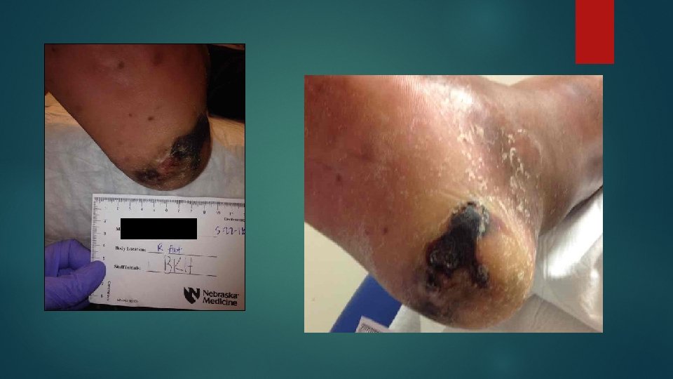 Case Study Pt is a 48 y/o male with ESRD on dialysis Pertinent past medical history At initial appointment patient reported discoloration on the plantar heel surface and was not sure he even had a wound. Had previous right fifth toe amputation due to osteomyelitis Had been fitted for diabetic shoes with custom inserts but preferred to wear Nike tennis shoes Diabetes mellitus Type 2 Retinopathy affecting both eyes Bilateral peripheral neuropathy that extends to below the knee Bilateral foot drop Gait abnormality Does not use walker as instructed Balance problems Reports fasting blood sugar of 130 History of previous diabetic foot ulcer on the same foot Eats only one meal a day and has frequent high carb snacks