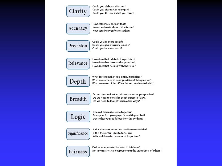 Questions of relevance force us to discriminate what does and what does not bear on a question. Questions of accuracy force us to evaluate and test for truth and correctness. Questions of precision force us to give details and be specific.