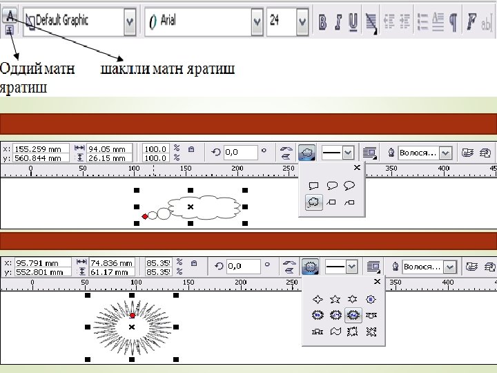 Strelkani tanlash qalamni qalinlashtirish Varaqni masshtabini o’zgartirish qalam vazifasini bajaradi Shakllar tanlash Shakllarni har-xil ko’rinishga o’tkazish Hoshiyani qalinlashtirish va hoshiya rangini o’zgartish Ramka ichidagi rangni o’zgartirish Ramkani bo’laklarga bo’lib rangini o’zgartirish Ko’p burchakni xar-xil ko’rinishga o’tkazish