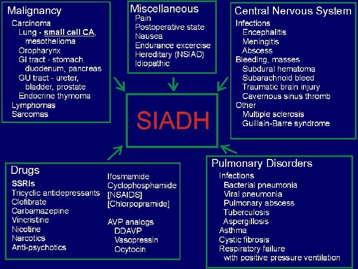 SIADH Inappropriate ADH response in a patient with hyponatremia. Urine is less than maximally dilute in the presence of relative euvolemia n Tx: free water restriction, loop diuretics, high protein and salt intake. Occasionally demeclocycline n