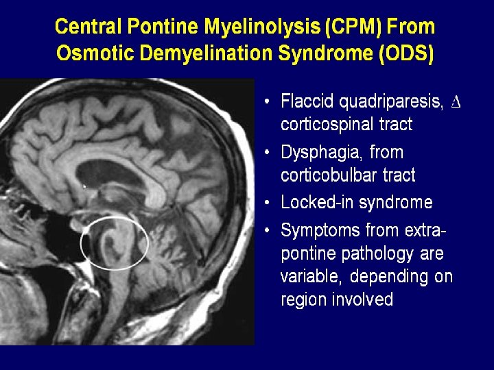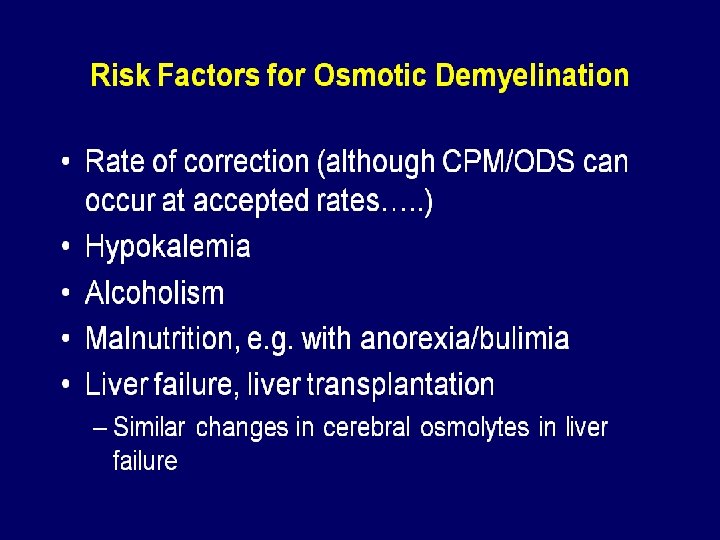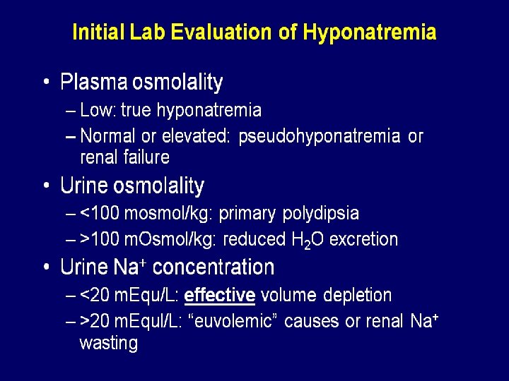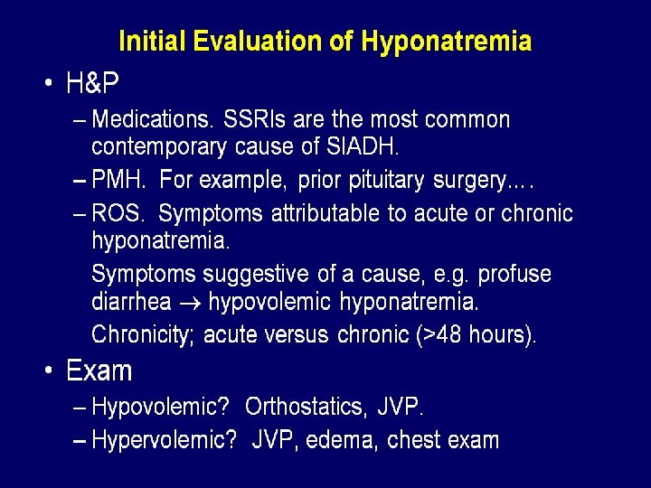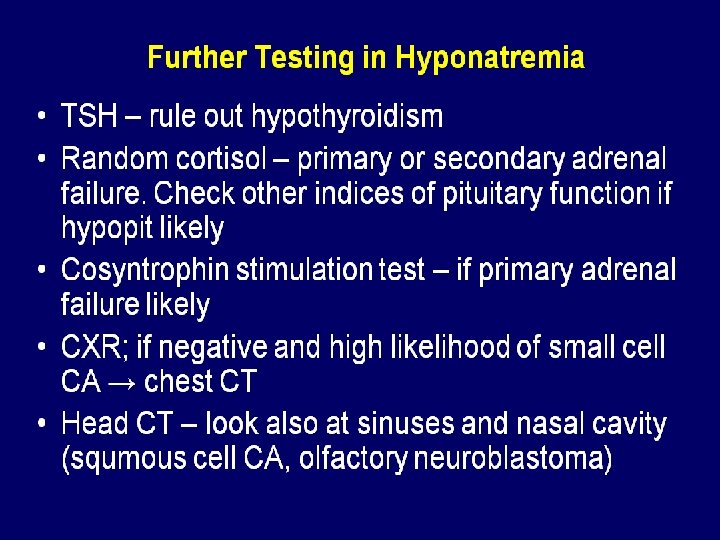 Symptomatic Hyponatremia CNS symptoms often respond to modest increases in sodium (<5%) n Initial rate 1 -2 mmol/L until symptoms resolve n Then 8 mmol total in first 24 hrs. n Then 10 mmol in next 24 hrs. n