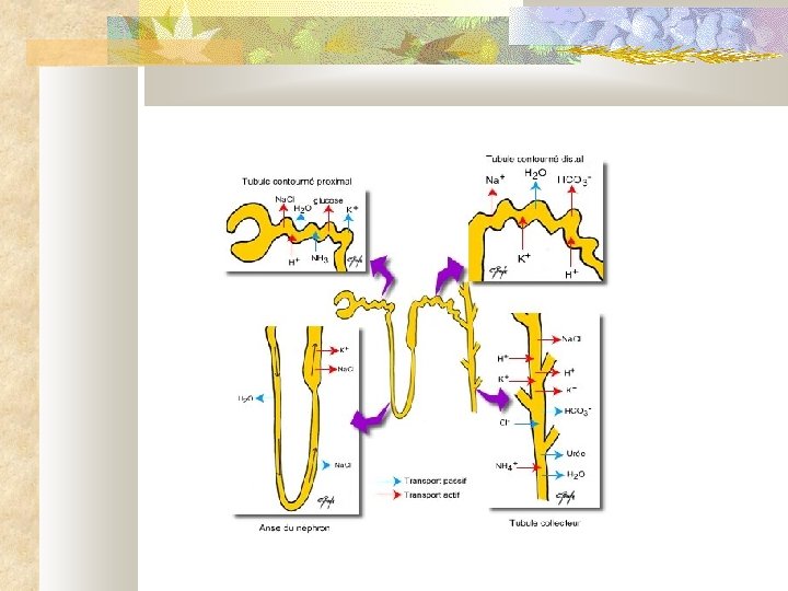 Dans le rein (1) Le rein filtre en permanence le sang (eau + solutés + éléments figurés ) à travers ses glomérules Il produit une urine qui contient les déchets de l'organisme (urée, acide. . . ) Na+, K+ et Cl- passent librement à travers la membrane du glomérule et se retrouvent dans l'urine primitive car ils sont de plus petite taille que les déchets => Pour ne pas créer de déficit, ces ions vont être réabsorber le long du tractus urinaire