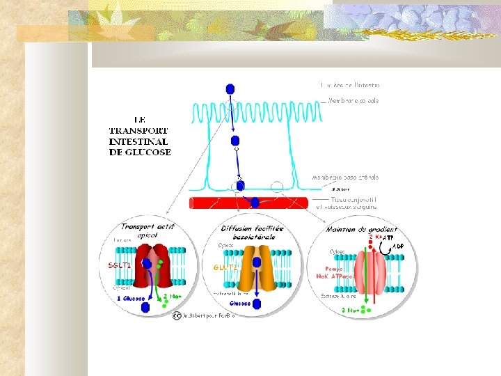 Dans l'intestin (1) Coté apical (lumière intestinale) les entérocytes absorbent activement du Na+ et du Cl- par les pompes ATPase Dans certaines diarrhées, les toxines inhibent ces pompes => fuite d’eau et de sel L'eau suit le mouvement du Na+ Ce flux d'eau et de Na + est accompagné du transport de glucose, acides aminés, vitamines (symport)