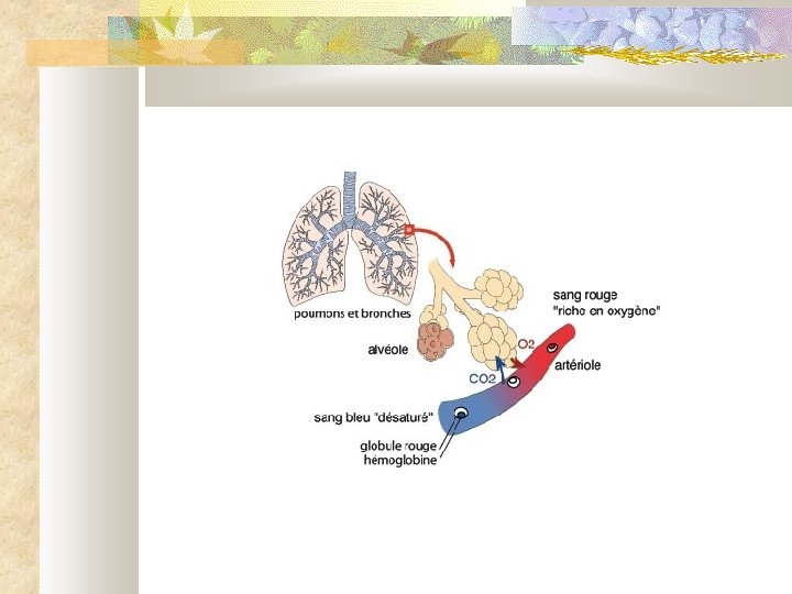 • Au passage des alvéoles pulmonaires, l'hémoglobine se sature en O 2 (oxyhémoglobine) • Une molécule d'O 2 se fixe sur chaque ion ferreux • L'hémoglobine libère son O 2 au niveau de la cellule, cette libération est favorisée par un milieu plus acide • Elle repasse à sa forme désoxygénée (désoxyhémoglobine) • Le cycle recommence à l'infini. . . .