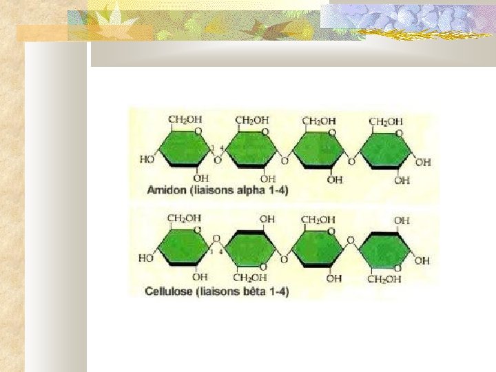 Exemples de polyoses ou polysaccharides § Cellulose : chaîne de glucose, non ramifiée, composant de la structure végétale § Amidon : chaîne de glucose, ramifiée, constituant la réserve énergétique de certains végétaux (pomme de terre, céréales…) § Glycogène : chaîne de glucose, extrêmement ramifiée, constituant la réserve en glucose des mammifères (dont l’homme)