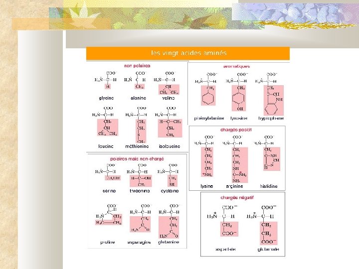 Acides aminés • « Briques » constitutives des protéines • Constitués d'une chaîne carbonée plus ou moins longue possédant : • – une fonction amine – NH 2 – une fonction carboxyle -COOH Il existe 20 acides aminés dans le monde vivant dont 8 sont essentiels et doivent être impérativement apportés par l'alimentation