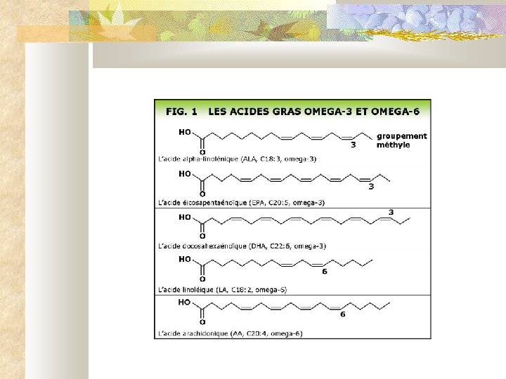• Les maillons de la chaîne hydrocarbonée sont reliés par les liaisons • Les liaisons peuvent être « simples » ou « doubles » • Les acides gras saturés ont un nombre pair de carbone et des liaisons simples • Les acides gras insaturés ont une ou plusieurs doubles liaisons, qui peut être en « trans » ou en « cis » • L'acide linoléique, l'acide alpha-linolénique l'acide arachidonique ne peuvent pas être fabriqués par l'organisme