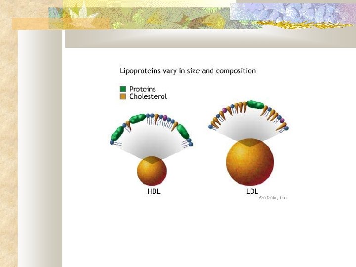 Cholestérol • Alcool cyclique • Composant fondamental des membranes cellulaires et des hormones stéroïdes • L'alimentation apporte du cholestérol • Mais plus 50% du cholestérol est synthétisé par le foie • Il est transporté sur les sites d'utilisation dans des vésicules de plus ou moins grande densité : VLDL, LDL et HDL