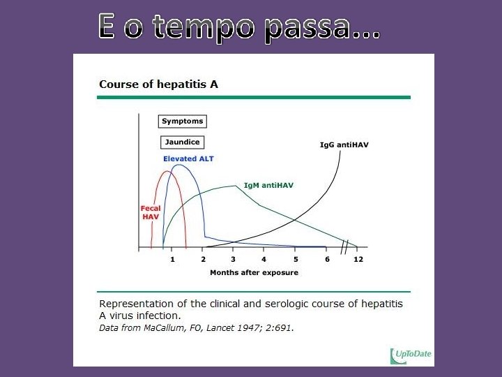 HEPATITE A- Manifestações • Hepatite sintomática : aproximadamente 30 % das crianças infectadas < 6 anos, alguns dos quais tornam-se ictérico • Crianças mais velhas e adultos com infecção HAV são geralmente sintomáticas durante várias semanas: Cerca de 70 % apresenta icterícia, e 80 % têm hepatomegalia. Os sintomas podem durar até seis meses.