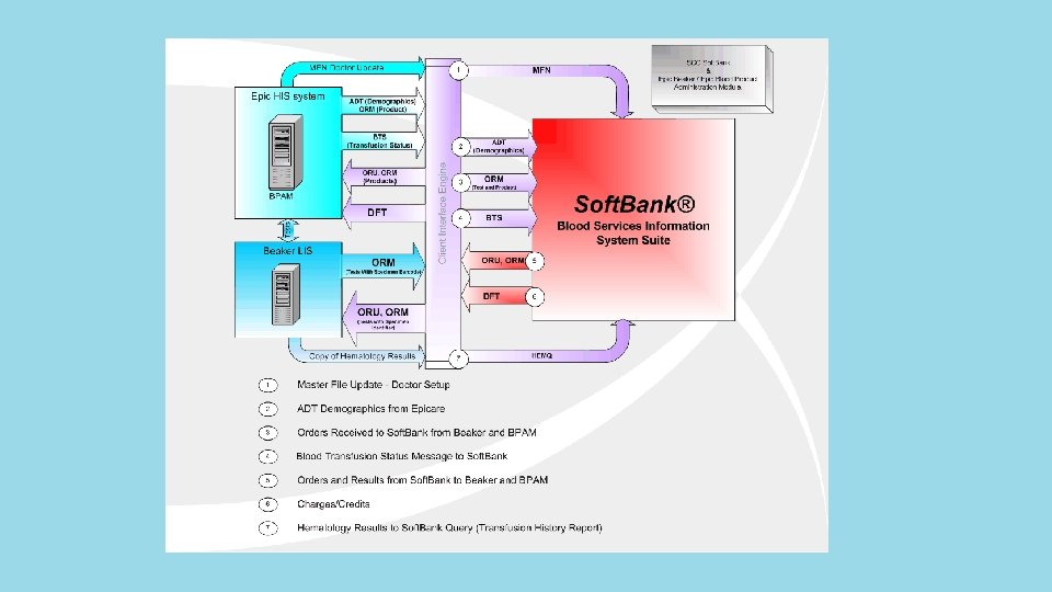 Soft. Bank Hematology Query • Hematology Results are routed from the Foreign LIS to Soft HIS interfaces and posted via Soft customized Hematology Results posting “instrument” interface • Client interface engine “copies” results messages to Soft. Bank when the department indicates Hematology from the Main LIS HIS results interface • Only a copy of the Result message (ORU) needs to be sent to Soft.