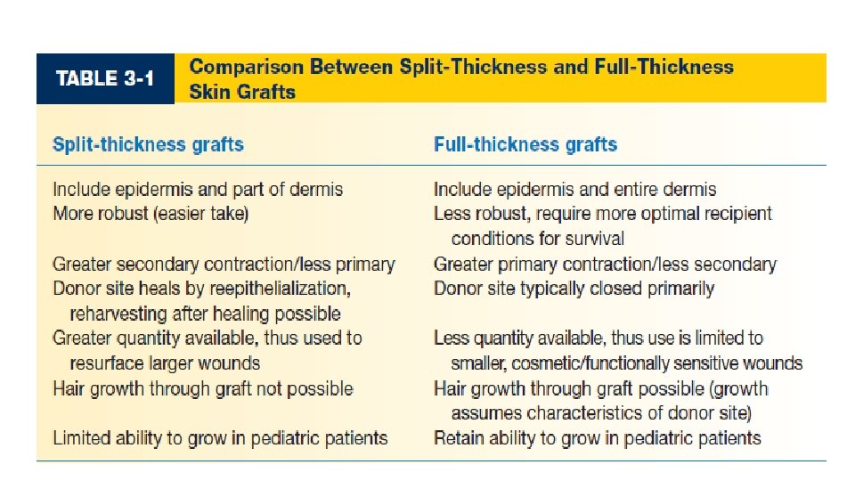 Full-thickness graft • Entire epidermis & dermis • Limited in size – leave defect with no healing potential • Donor site needs direct closure or SSG • Chose donor site for good colour and texture match