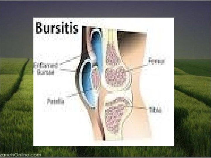 Soft Tissue Syndrome Prepatellar and Infrapatellar Bursitis Ø Etiology: trauma, frequent kneeling (housemaid’s knee), inflammatory (gout, septic) Ø Clinical manifestation: pain, tenderness, swelling, hotness and redness (septic) Ø Treatment: aspiration and culture, steroid injection, modified activity