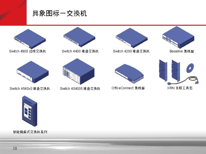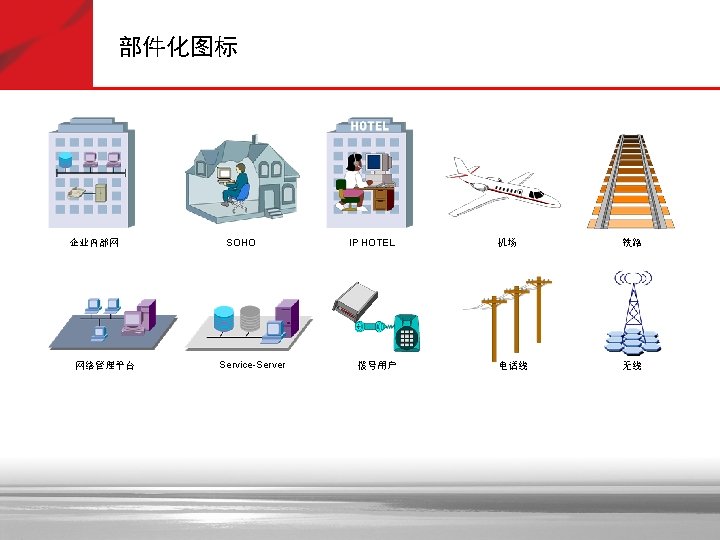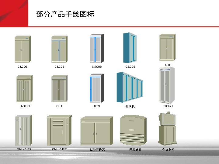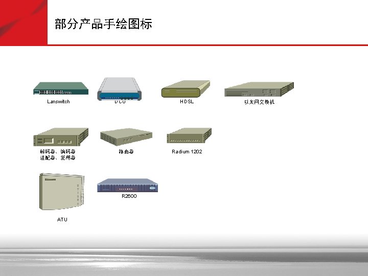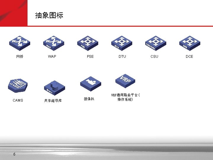 抽象图标—黄色 Soft X(CS) SGW 信令网关 Portal 拓扑管理 GK AAA 策略管理 服务器 MSTP Lan Switch VOATM GW NAS SIPP CMTS 路由器 AMG 5000 Cach(缓存) SIP Server Bridge C&C 08 MRS 6000 PBX Metro ATM 交换机 SMⅠ SMⅡ i. OLT 信令管理 APP Server OLT MD FA MA 5200 ONU AGW Radium 8750 TMG 8000系列 MA 5100 VOIP GW VOIP功能 MSR多业务 路由器 交换机 (ATM/IP/MPLS) IAD